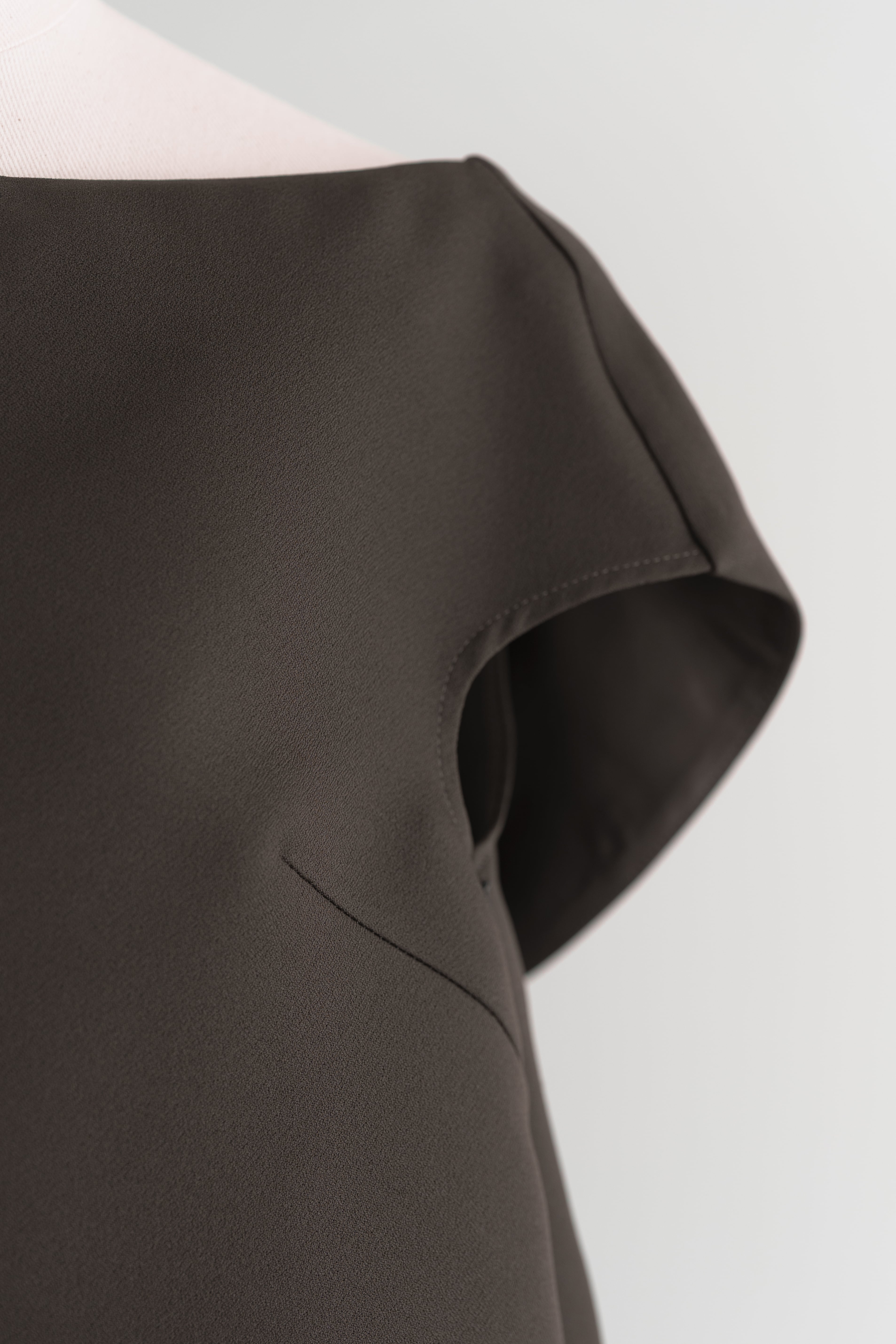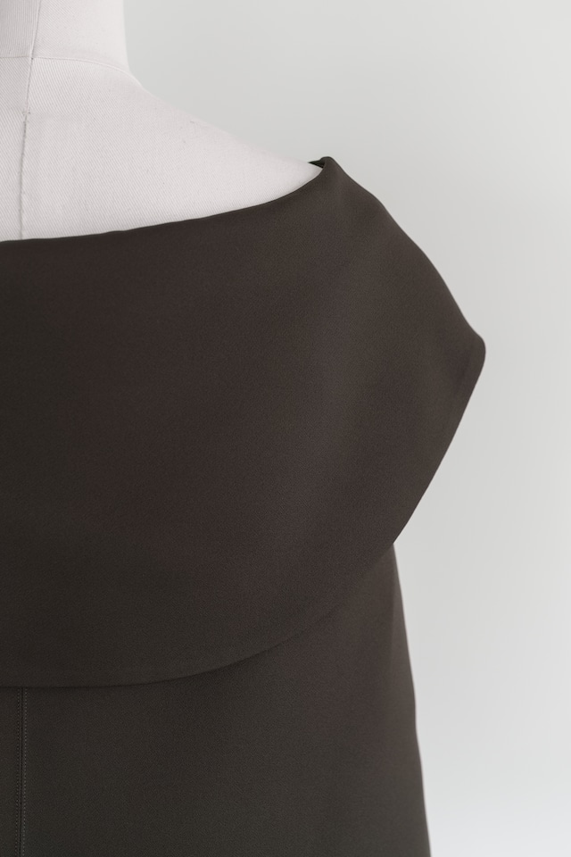 鎖骨のラインを美しく引き立てる、オフショルダーのデザイン。