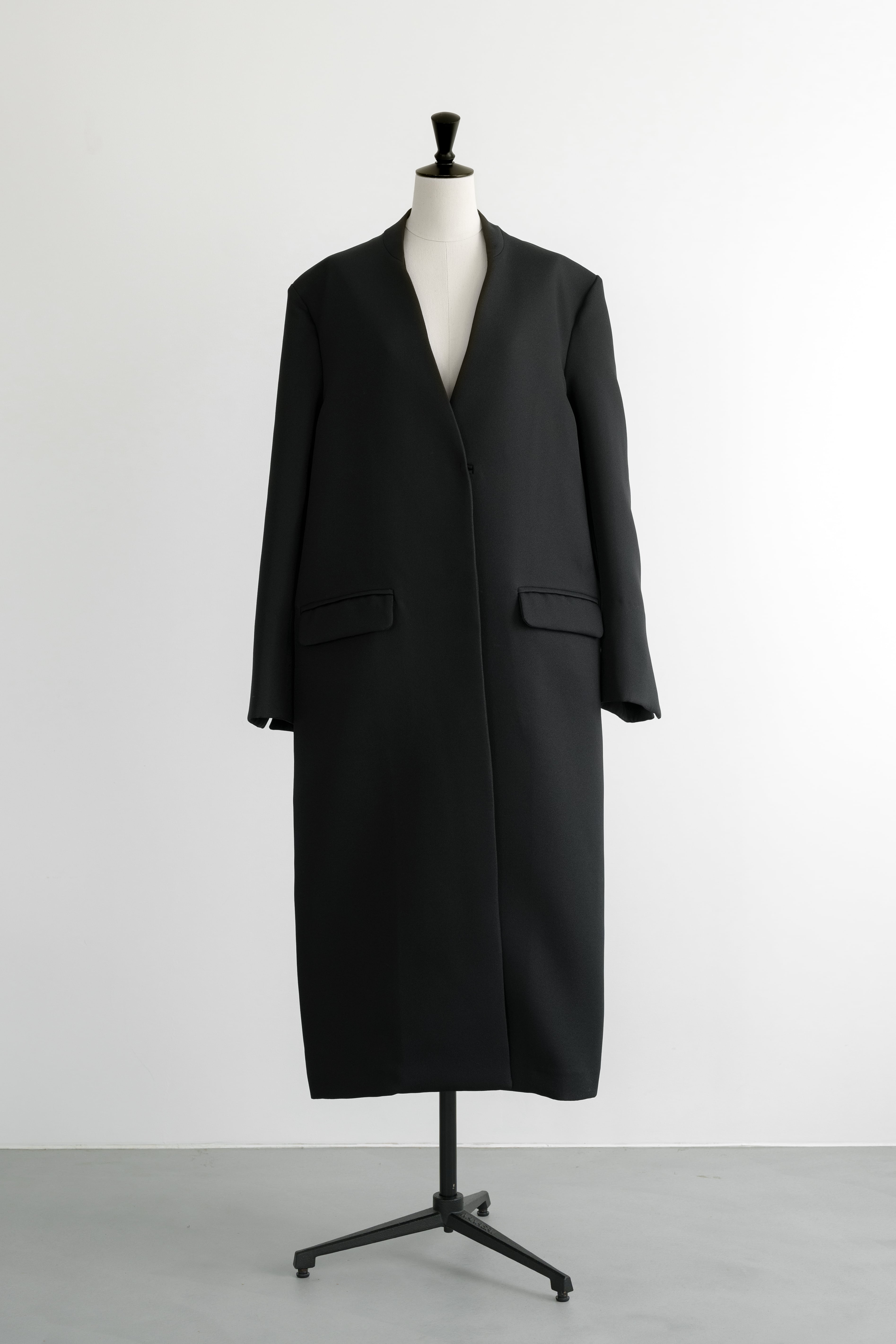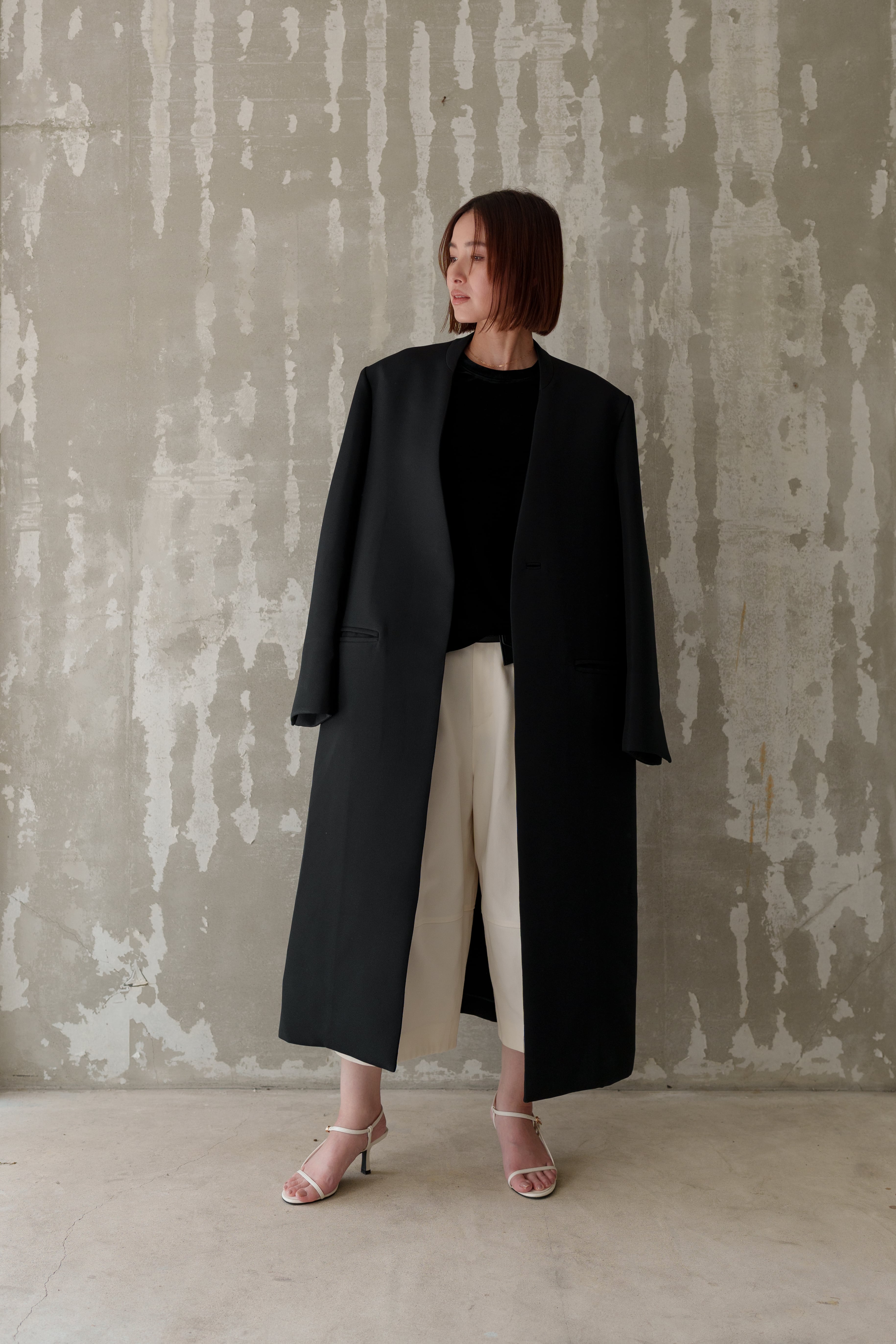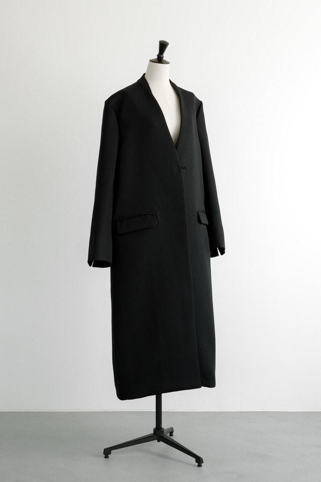 無駄を削ぎ落としたミニマルなデザインで仕立てたロングジャケット。