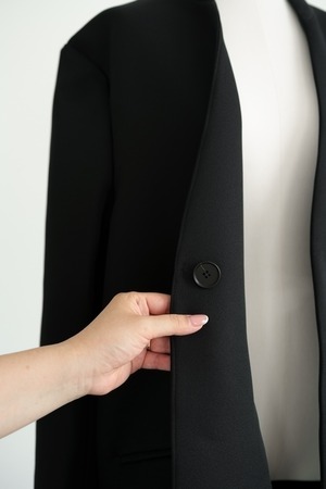 すっきりとしたショルダーラインと直線的なフォルムが、着る人の存在感を引き立て、纏うだけで洗練されたムードを生み出します。