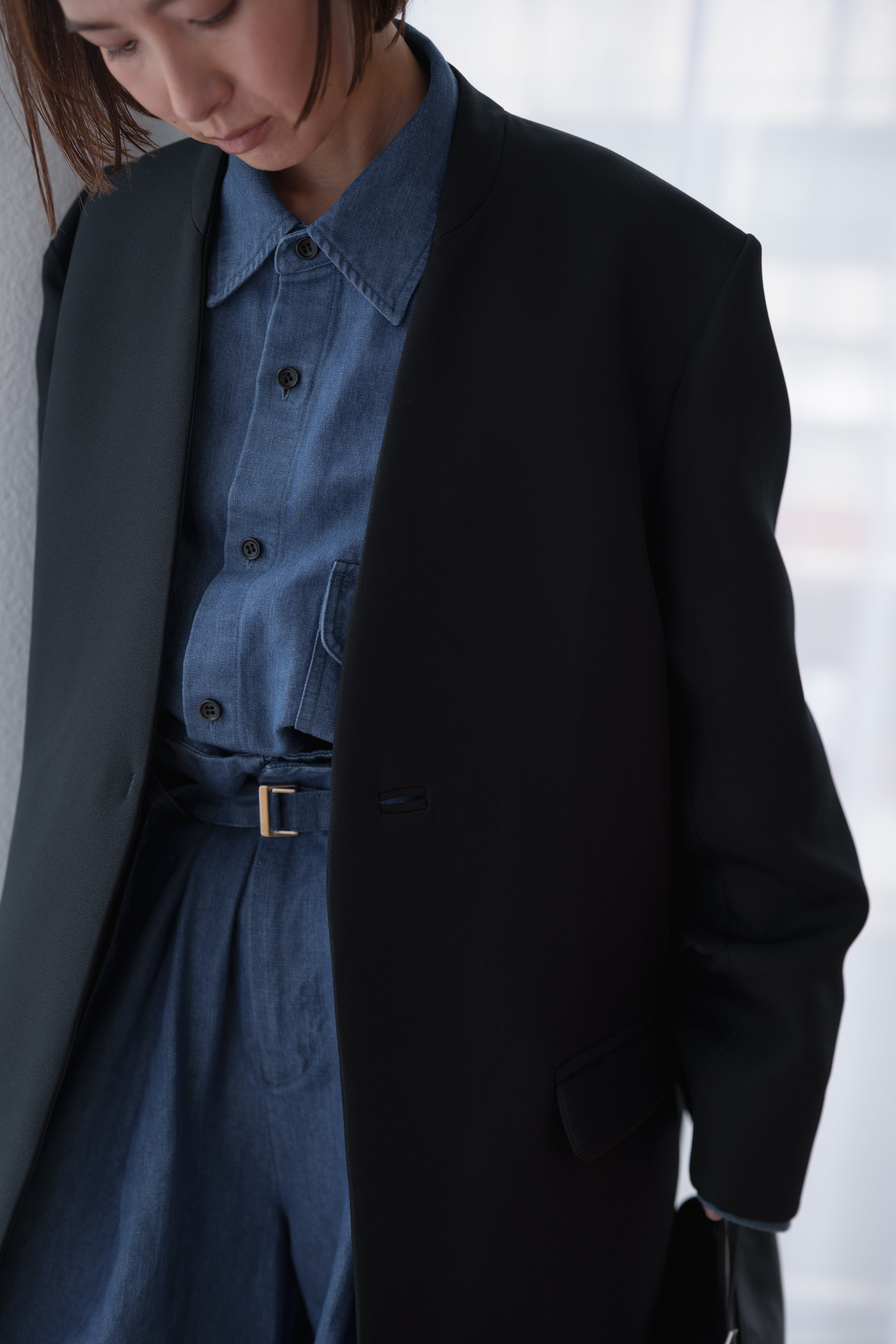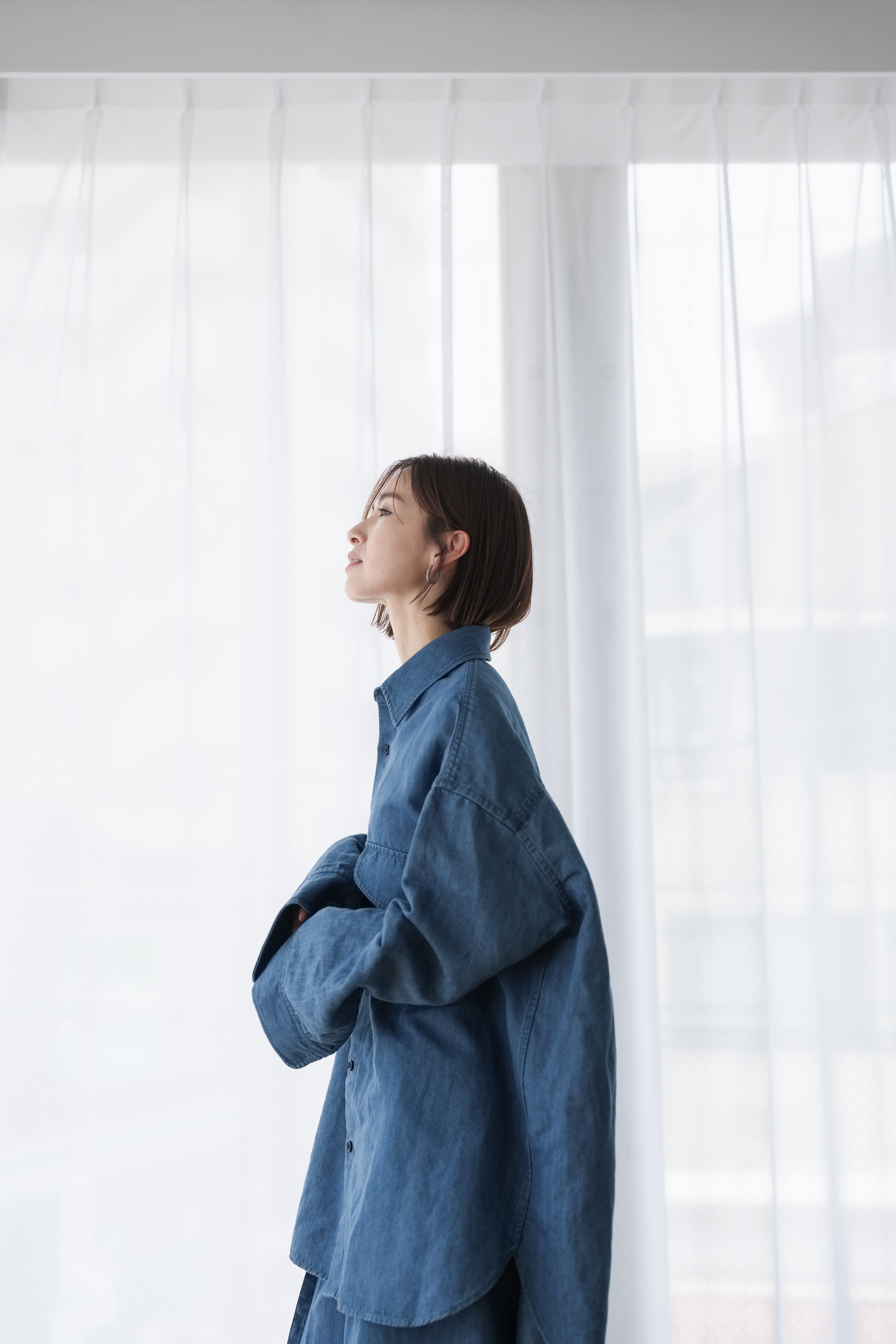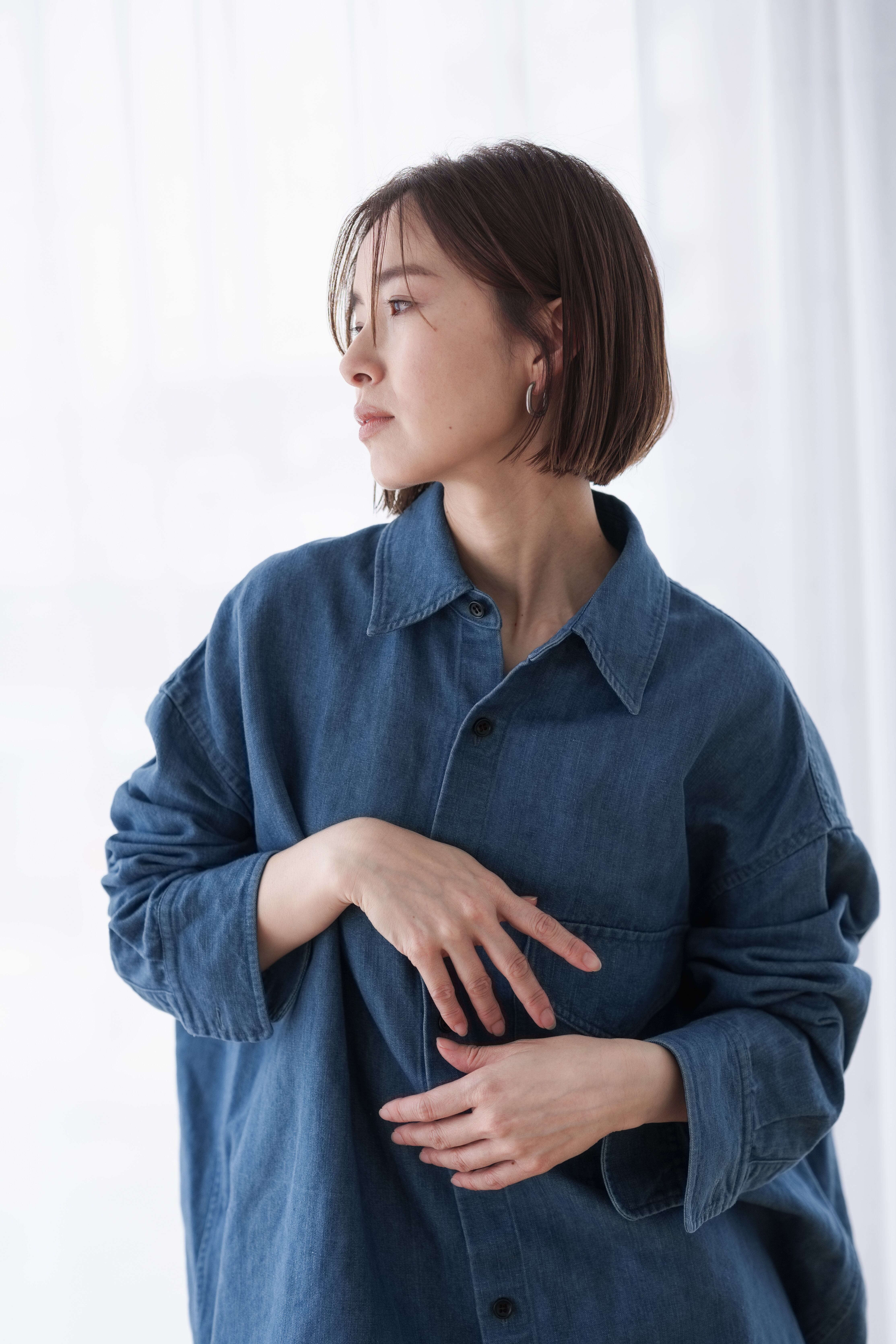 程よく落ち感のある柔らかなデニム生地を採用し、ハリ感を抑えたしなやかな風合いで仕立てています。纏うだけで自然なドレープが生まれ、ラフでありながら洗練された空気を纏える一枚です。