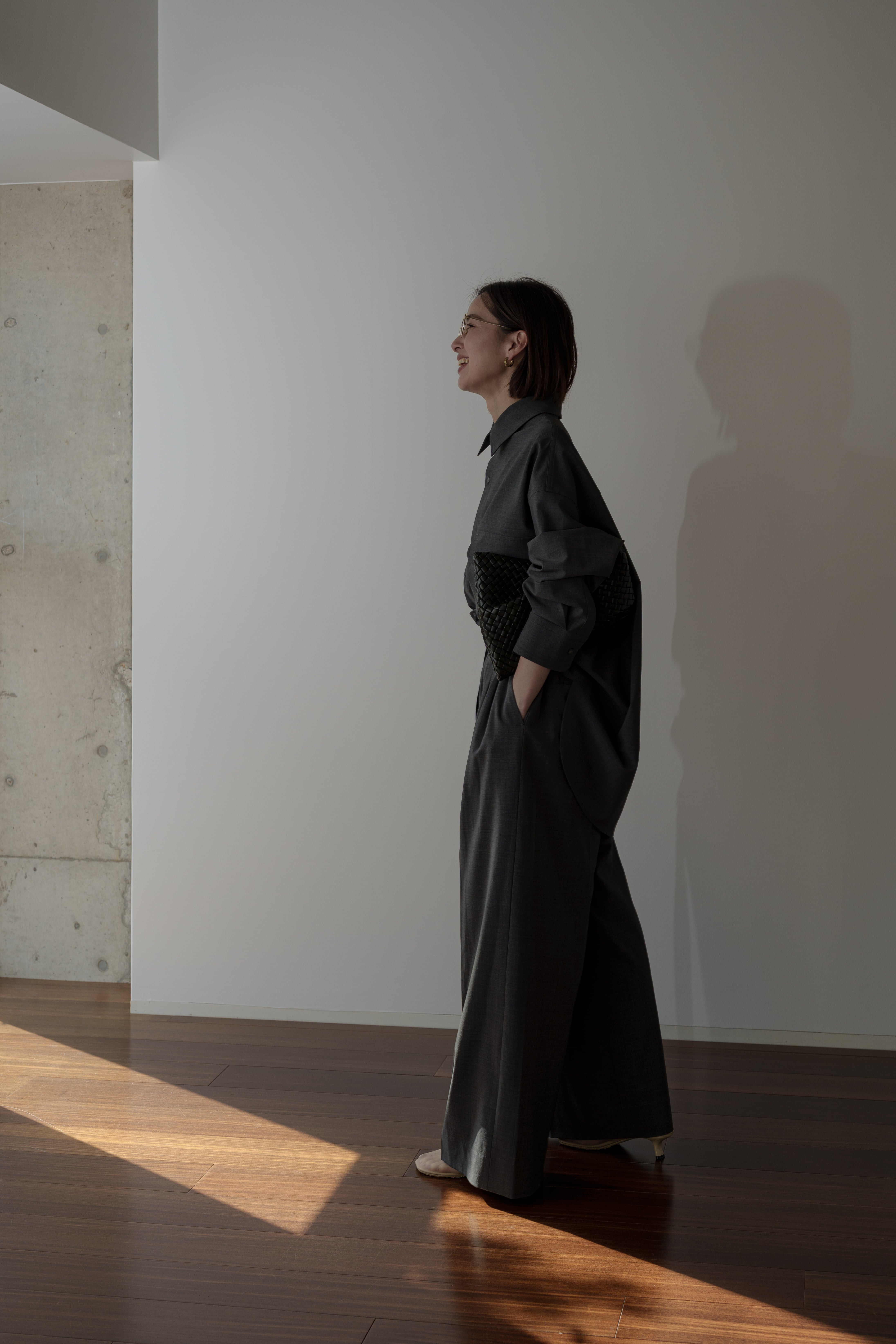 肩を落としたリラックスシルエットながら、直線的なラインと長めの丈感が