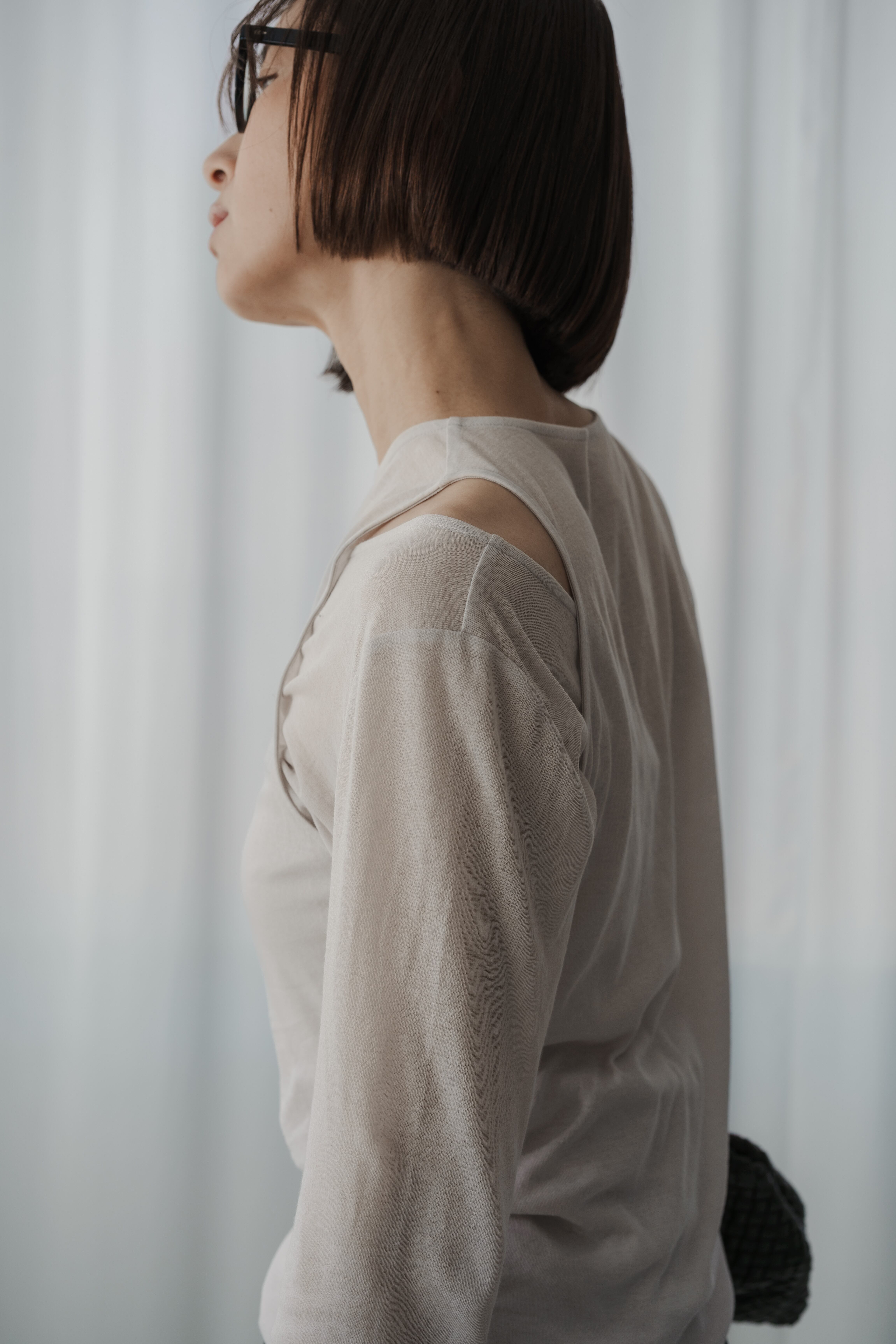 2枚のシアー素材を重ねた、レイヤードデザインのトップスです。