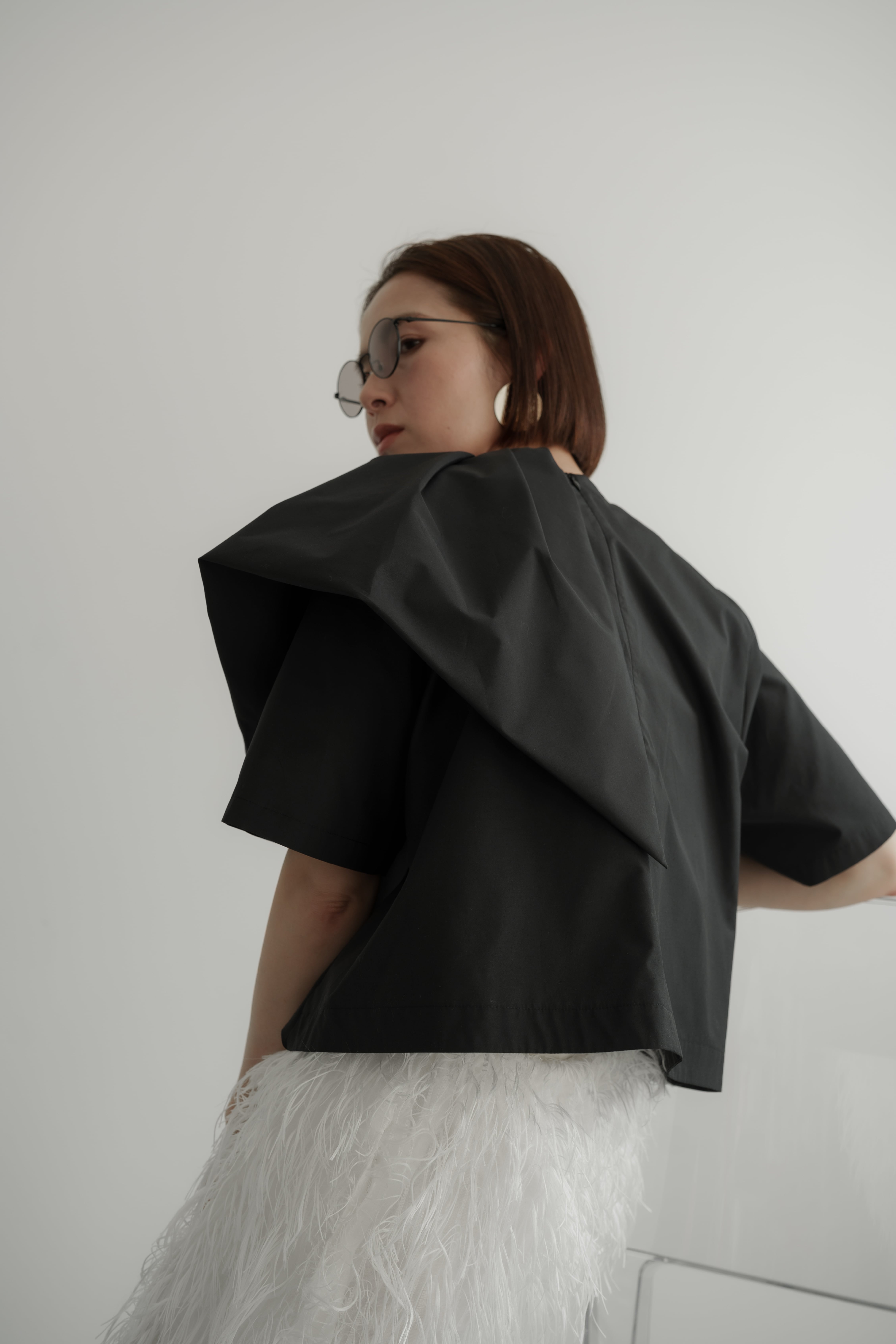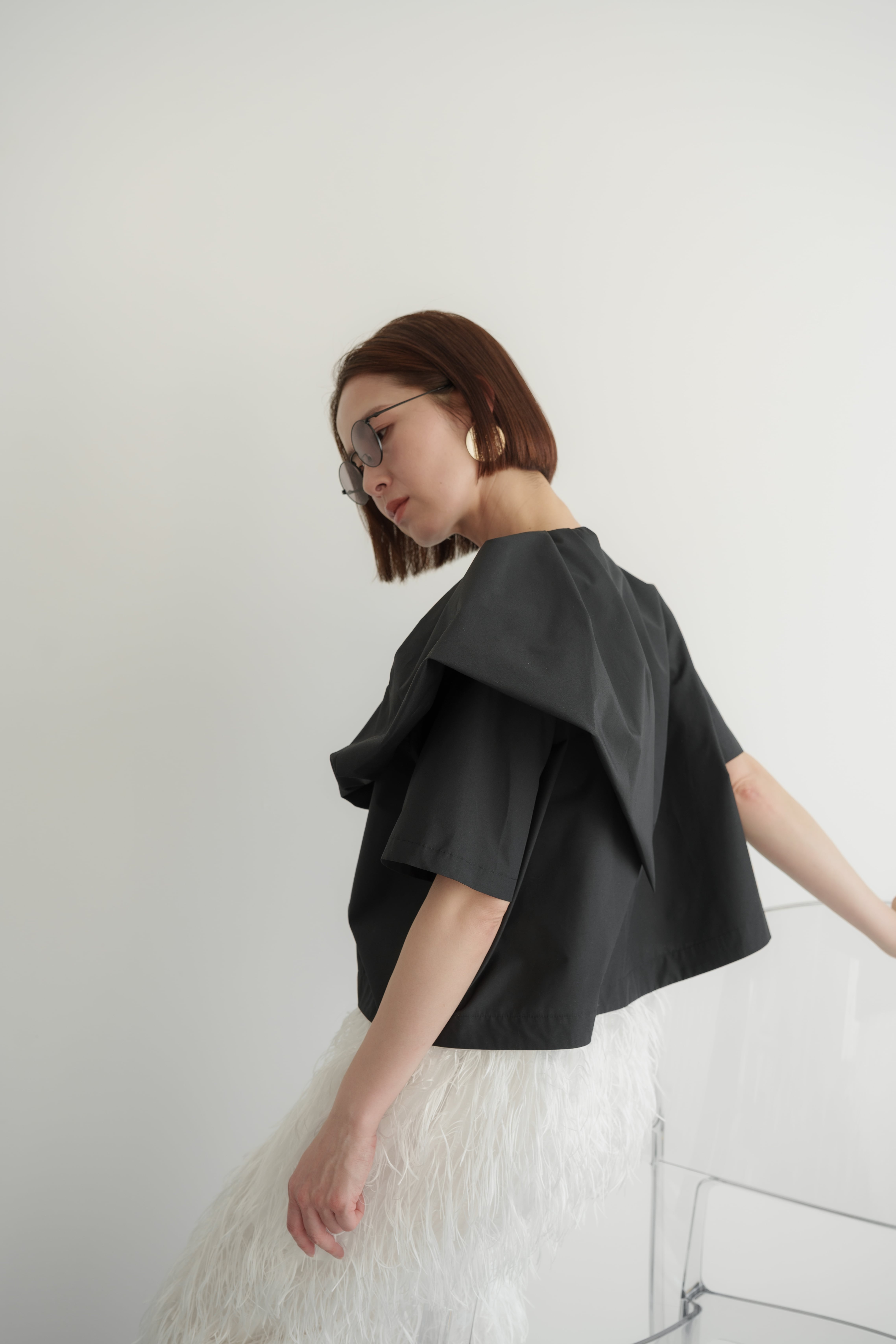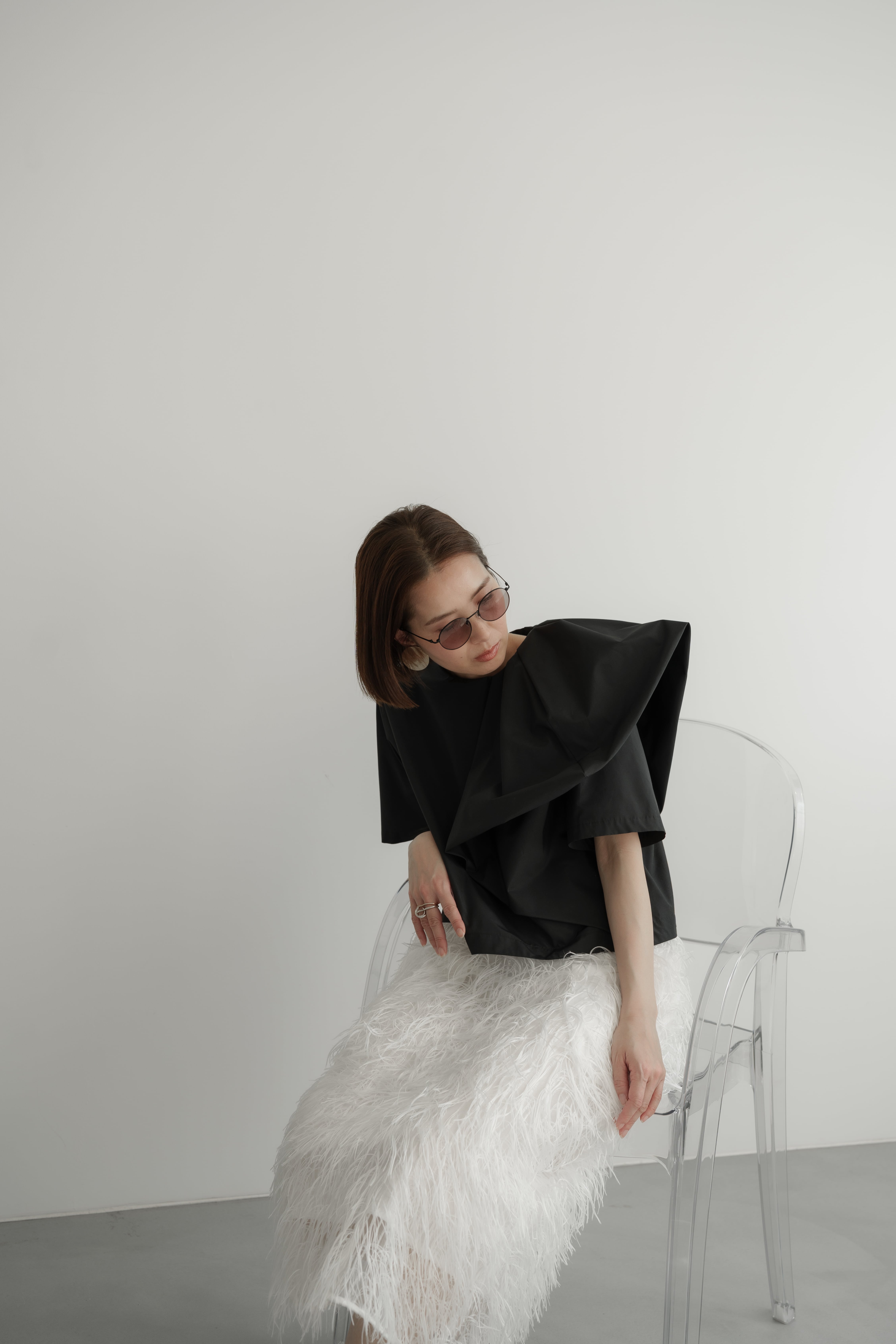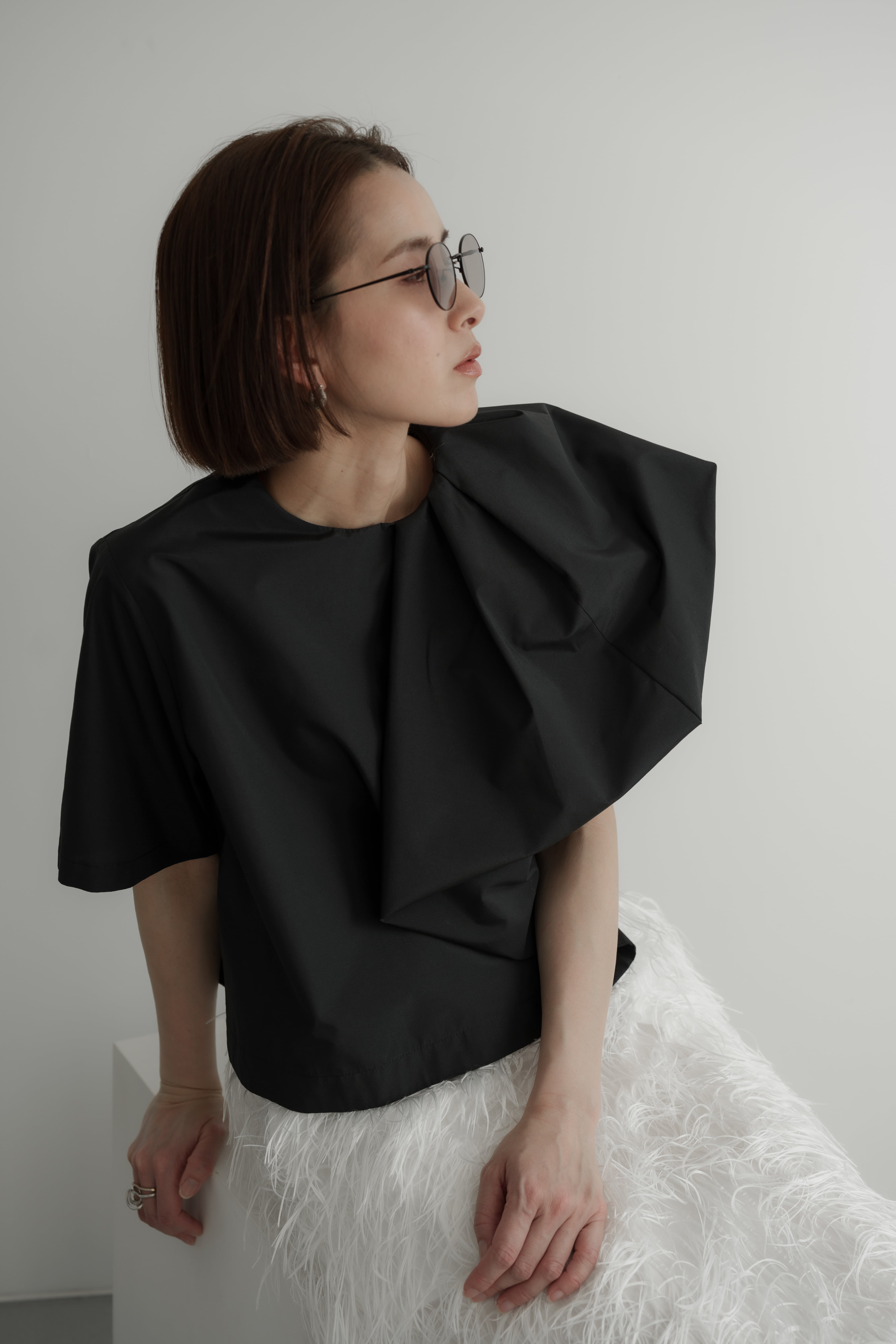 肩にかけて流れるように施された立体的なフリルは、動きに合わせて表情を変え、