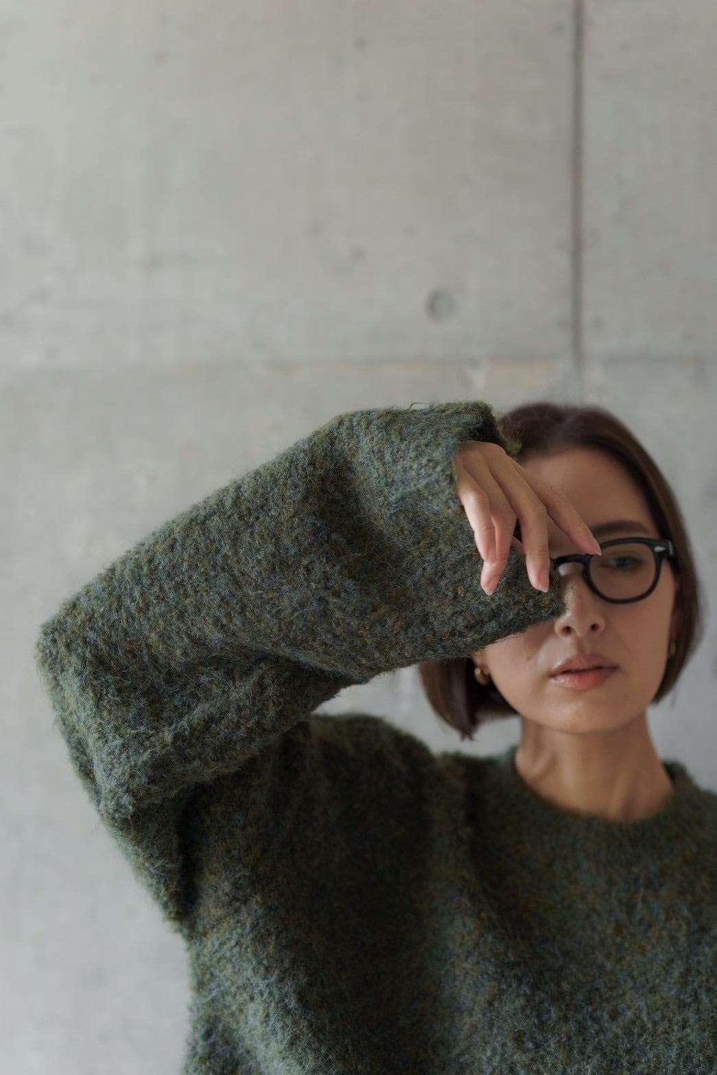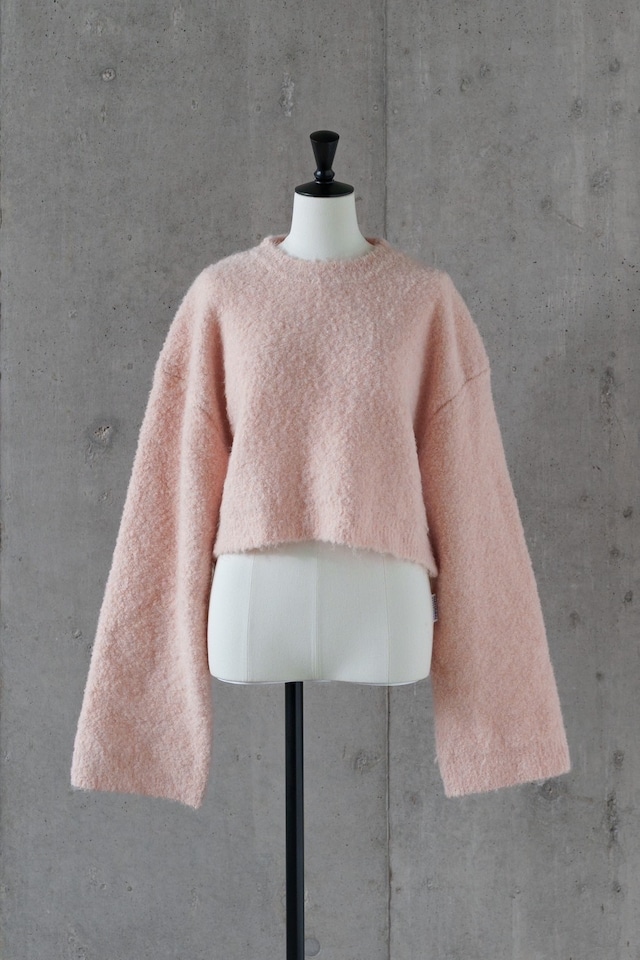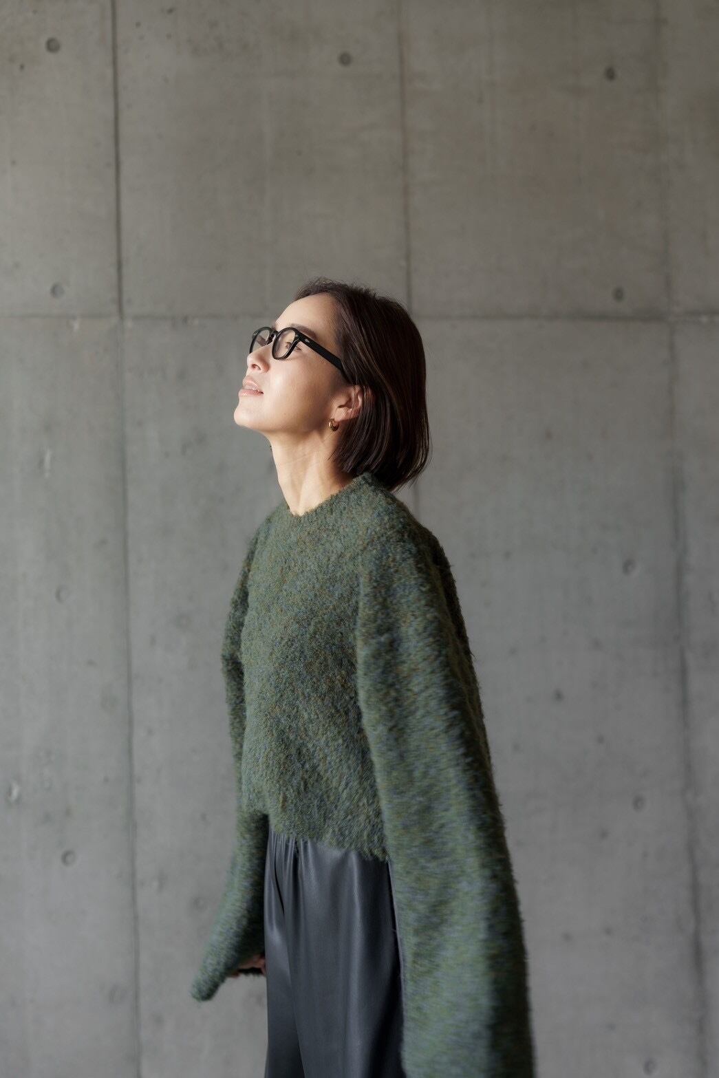女性らしい印象を演出する短めの丈感と、袖のたぽっと感が特徴です。このニットは、カジュアルな装いにもエレガントなスタイリングにも合わせやすく、幅広いシーンで活躍してくれます。