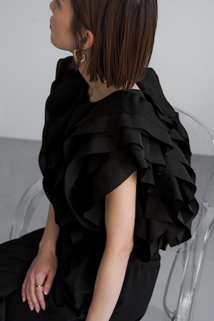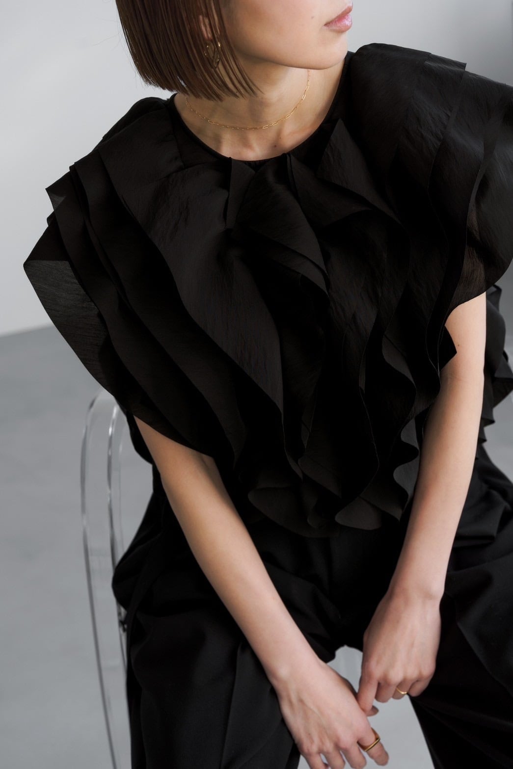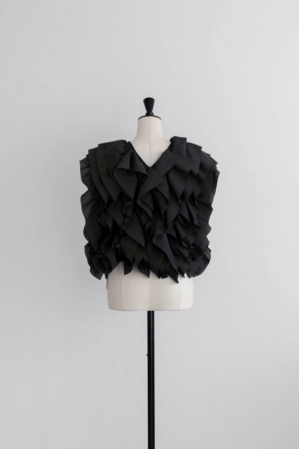 前後2WAY仕様で、UネックとVネックをお楽しみいただけるフリルベスト。