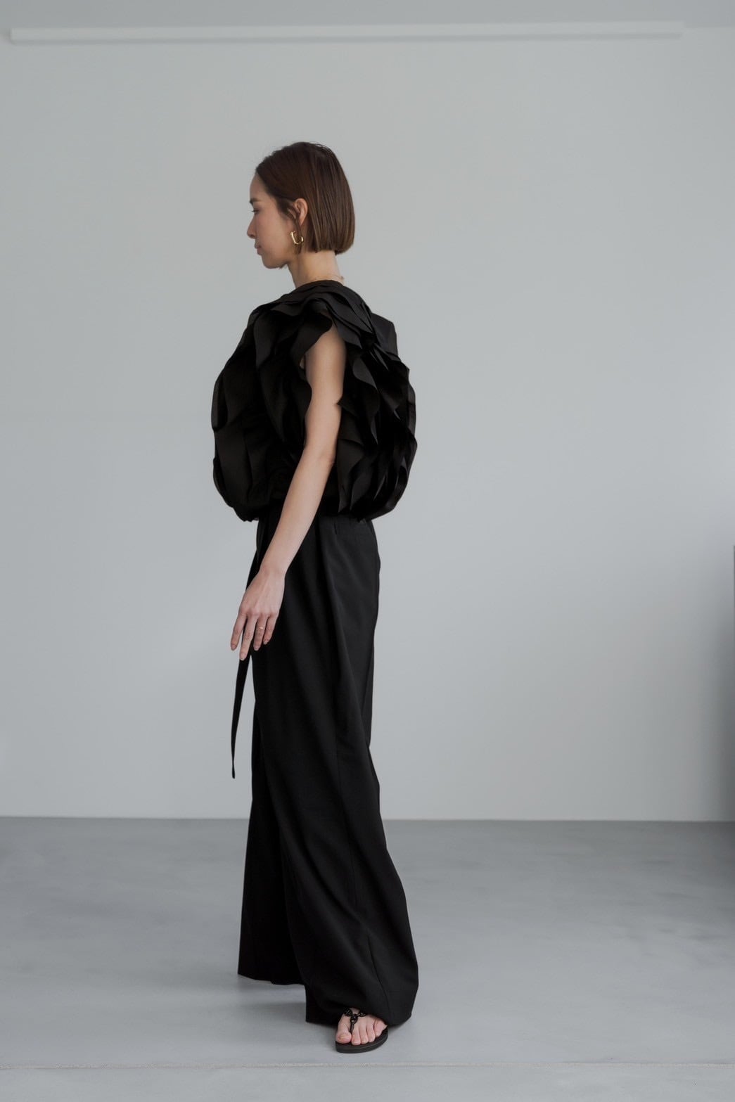 花びらのように一枚一枚丁寧に縫い付けられたフリルは、繊細さと立体感を生み出し、特別感溢れるデザインに仕上がっています。